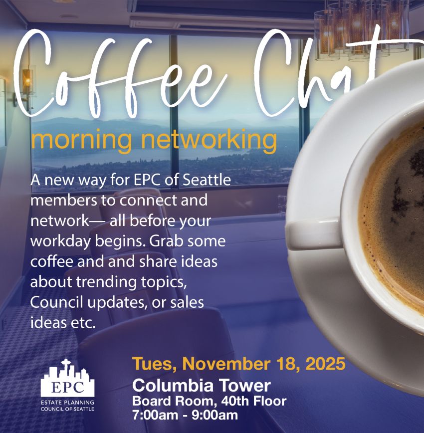 Looking for a chance to connect with fellow Estate Planning Council members outside of our usual dinner meetings? Join us for a relaxed morning Coffee Chat high above the city in the gorgeous Columbia Tower Board Room on the 40th Floor.